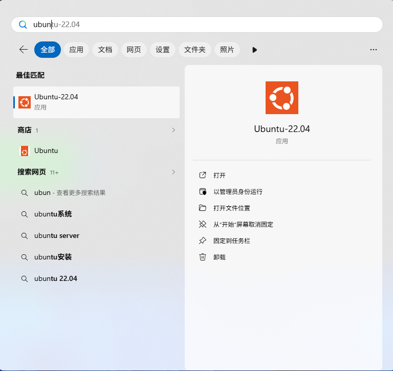 进入 ubuntu,可以搜索 ubuntu 点击进入,也可以通过命令: