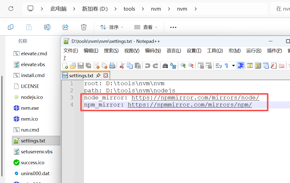 在 nvm 的安装路径 D:\nvm\nvm 下找到 settings.txt 文件,在末尾加上这两行,设置国内淘宝镜像源: