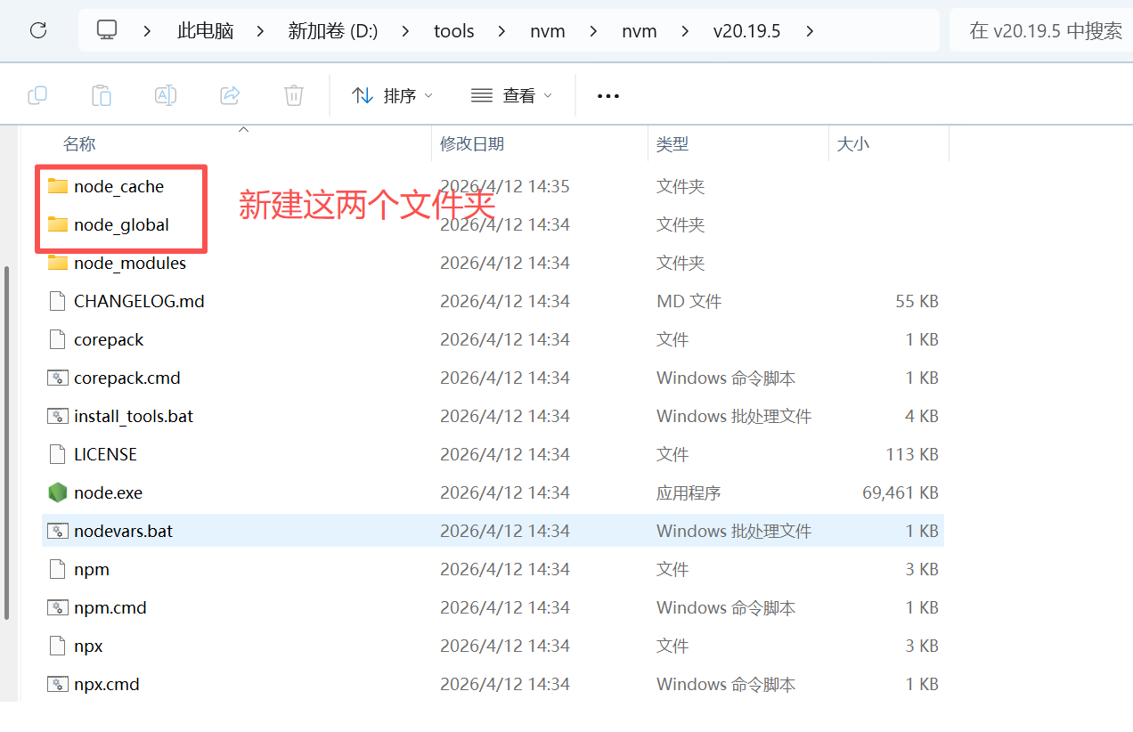 选择刚刚安装的 node 版本文件,新建 node_cache 和 node_global 文件夹。不同 node 版本均按以下操作一遍。