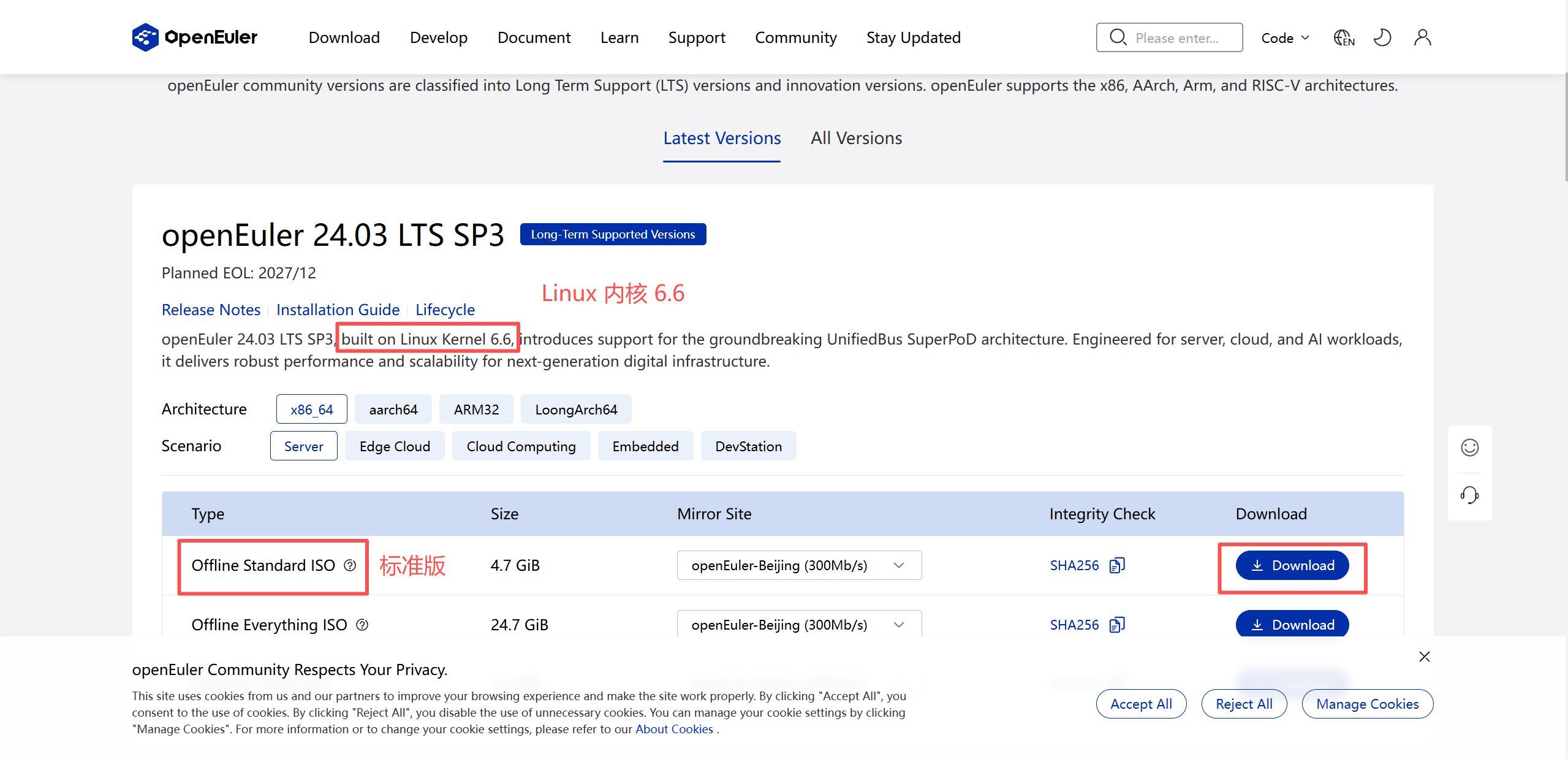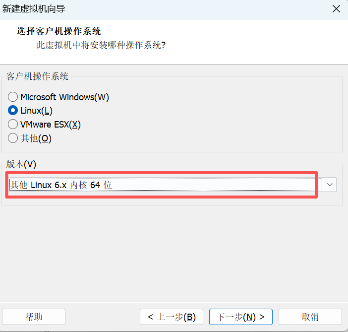 这里采用 VMware 安装,注意版本选择,上图标明 24.03 版本使用的 Linux 内核为 6.6,所以 VM 选择版本时,选择其他 Linux 6.x 内核 64 位,如下图: