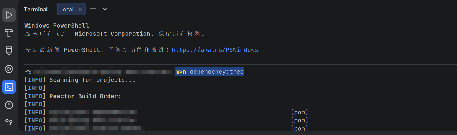 # 如果没有引用个人私仓依赖的,可以直接使用以下命令。如果有依赖,先在业务工程项目 install 以下再执行,否则下不下来依赖会报错。 mvn dependency:tree